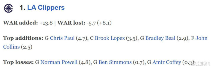 从这一档名单也不难看出,ESPN这份基于WAR调整幅度公布的评选榜单并非与球队实力直接挂钩,而是完全基于休赛期阵容的调整。