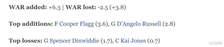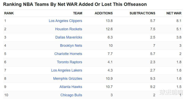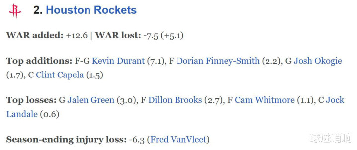 高阶WAR数据也直观显示火箭队在引援阵容调整方面高居联盟第一,无奈的是,范乔丹在训练营开启前重伤,而他的WAR值高达6.3导致火箭队遗憾无缘榜首。